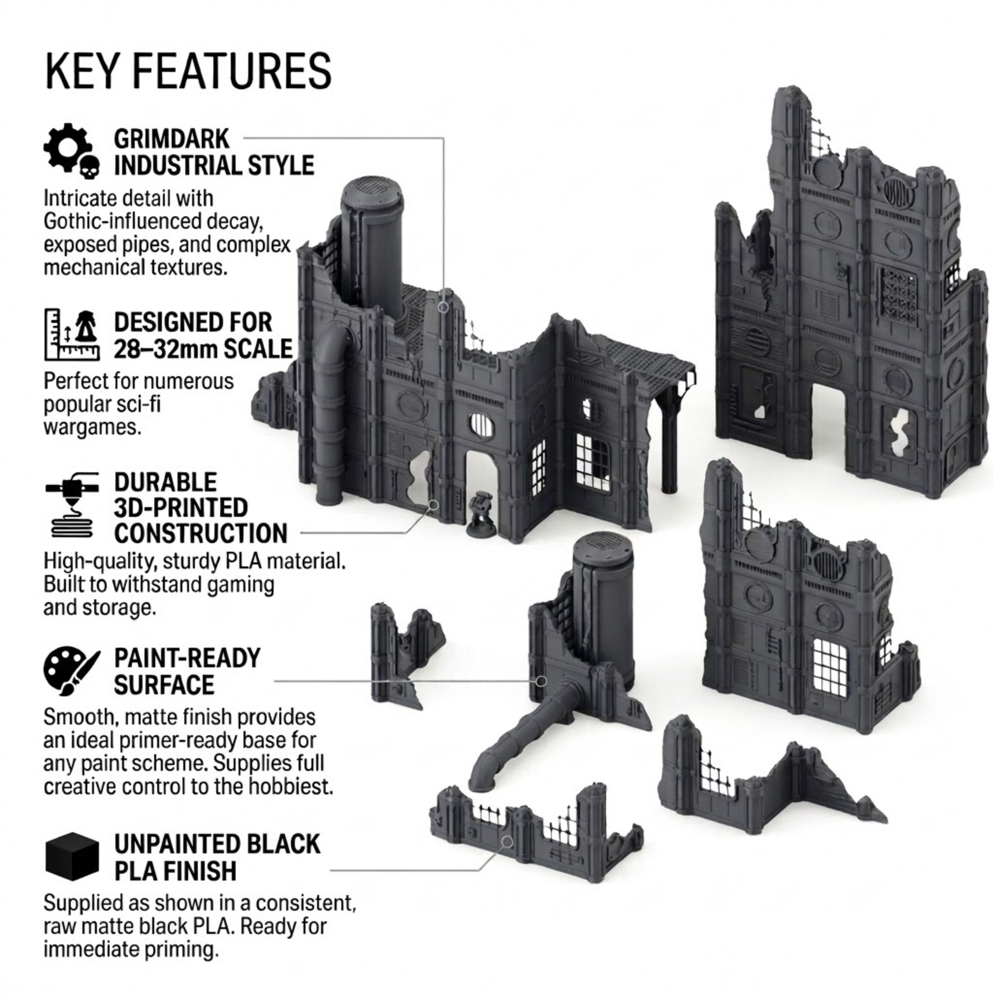 Printed in black PLA (unpainted) for a durable, paint-ready finish—ideal for players who want a cohesive industrial battlefield that feels like an objective you’d actually fight over: seize the loading bay, sabotage the pipeline, or hold the main production block.