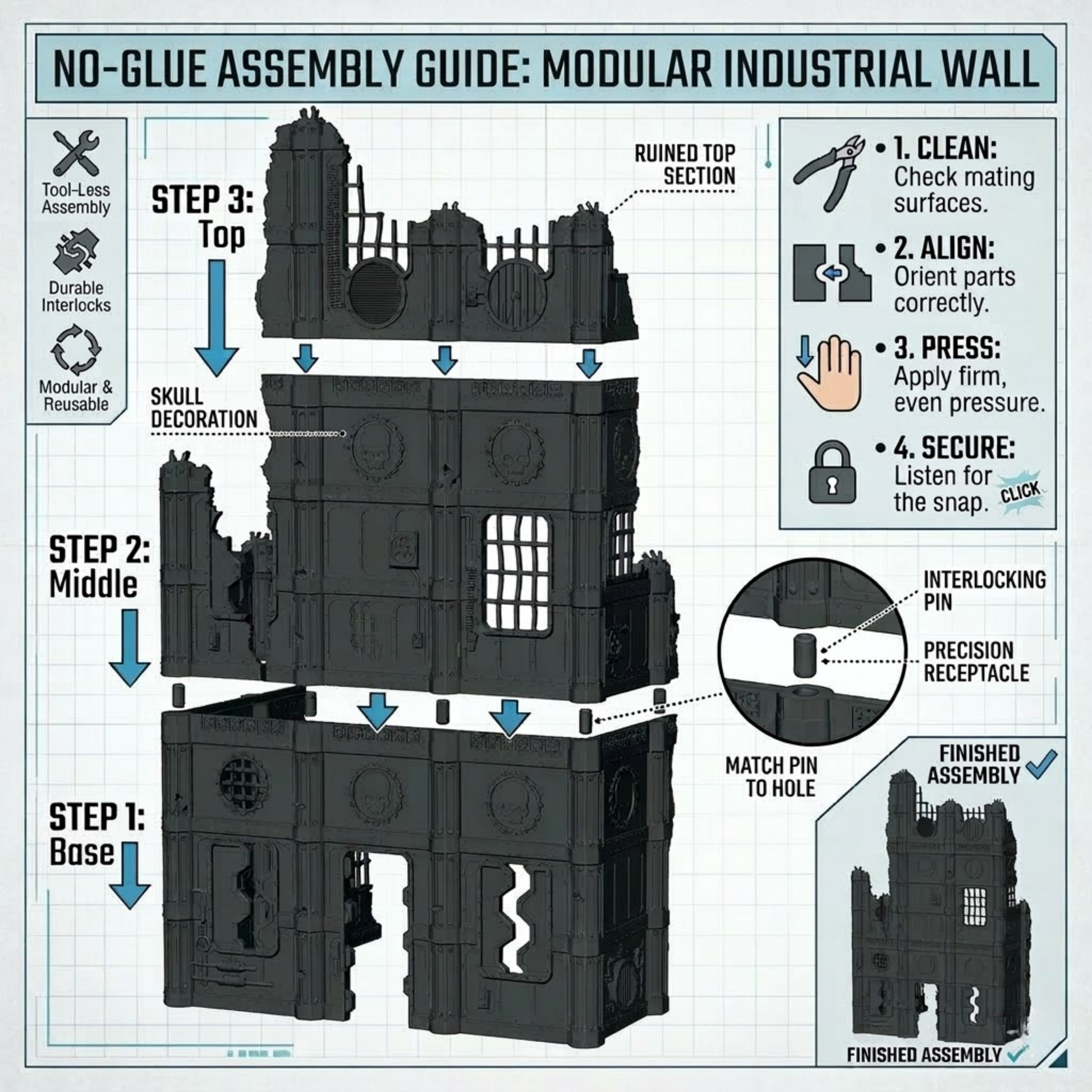 Gameplay utility: A true mix of landmark LoS blockers (3-story), midboard anchors (2-story), and low scatter walls for cover pockets and objective clutter.