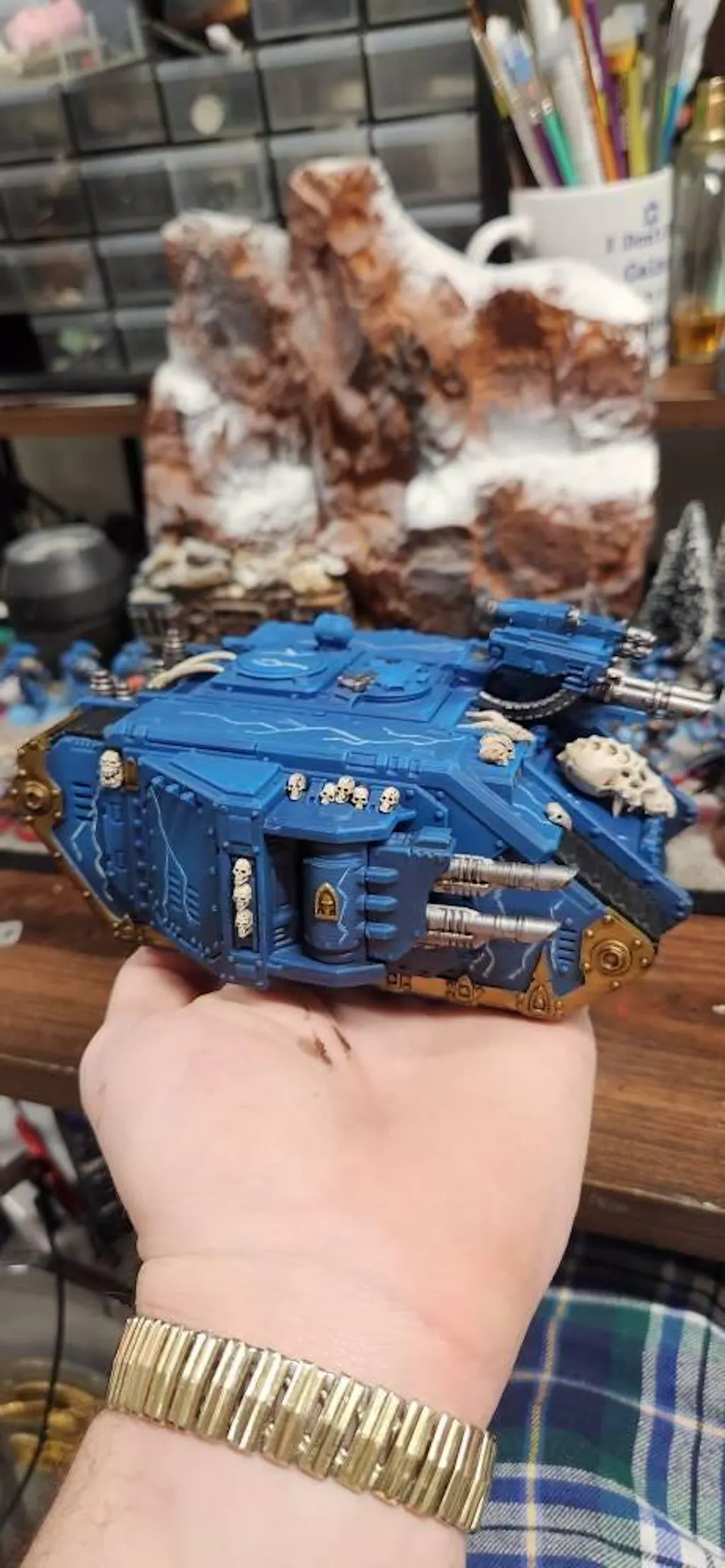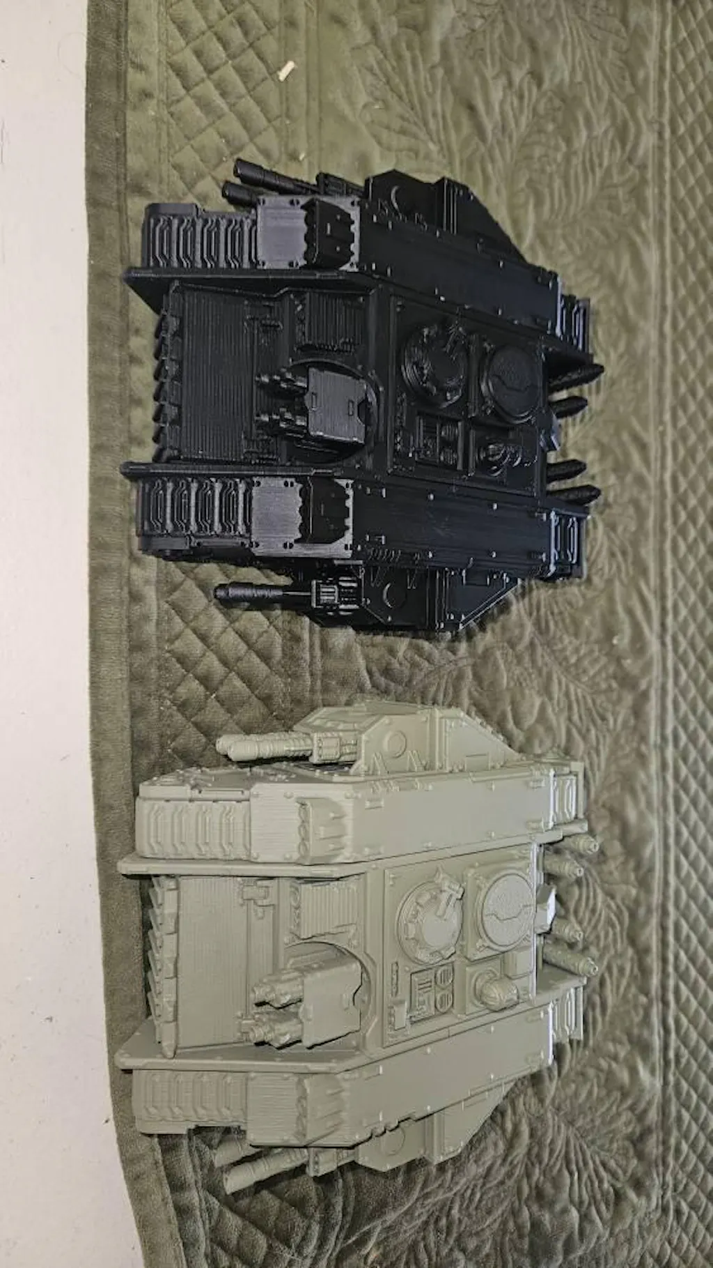 A hulking, slab-armored assault tank for grimdark tabletops. Broad hull, turret mount, and side weapon pods make it a perfect line-breaker or troop-delivery centerpiece. Scaled for 28–32 mm games and 3D printed (unpainted).